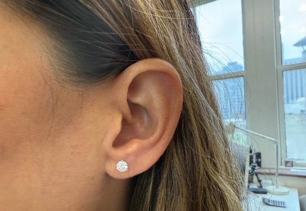 Experience the pinnacle of luxury with 2.08 carats of Natural Round Diamonds (Color I, Clarity SI2) set in timeless Platinum Studs. These 3 Prong earrings are crafted to capture light...