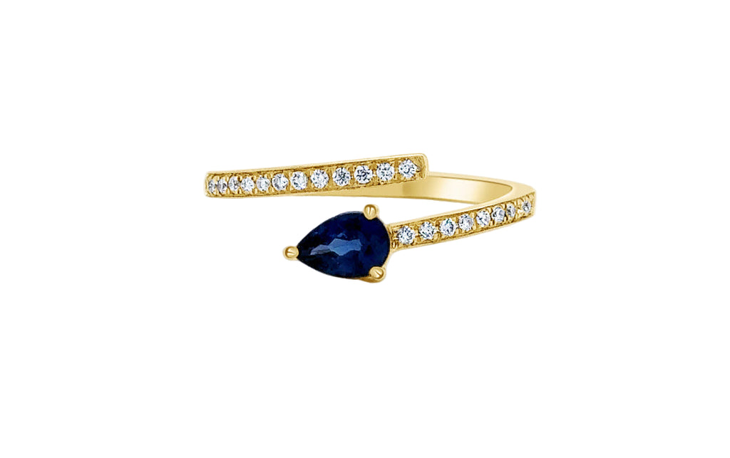 Crafted from 14kt Yellow Gold, this delicate Ring comes enriched with one Pear Shape Blue Sapphire 0.48 carats and Round Diamonds 0.14 carats. Size 7.
