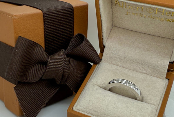 This exquisite half-band ring is crafted in luminous 14kt white gold, offering a sleek and modern silhouette that embodies understated sophistication. A row of 8 sparkling diamonds, totaling 0.74 carats,...
