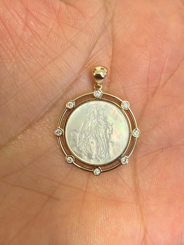 Necklace 14kt Gold Mother Pearl Diamonds Medal Pendant