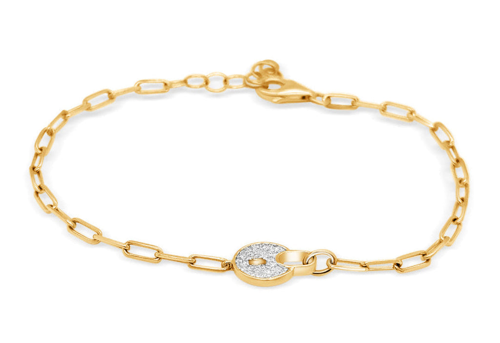 Delicate yet striking, this 14kt gold bracelet features a fine chain adorned with a graceful padlock charm, symbolizing strength and connection. Thirty-three pavé-set diamonds, totaling 0.07 carats, lend a subtle shimmer, catching the light with every movement. Designed with an adjustable 7-inch length for a comfortable, tailored fit, this timeless piece is a refined expression of elegance—perfect for everyday sophistication or layered luxury.