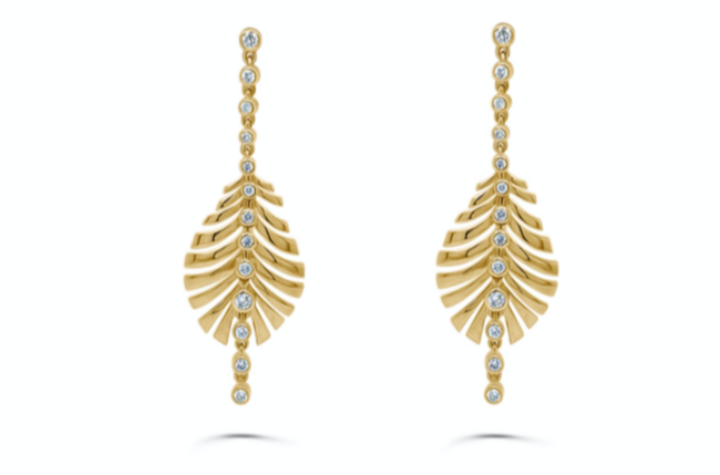 Inspired by the graceful beauty of nature, these 14kt gold earrings feature an elegant leaf motif, sculpted with delicate precision. Embellished with 26 dazzling diamonds totaling 0.39 carats, each leaf shimmers with refined brilliance, capturing the light with effortless grace. A harmonious blend of organic form and timeless luxury, these earrings offer a sophisticated touch of nature's poetry—perfect for both day and evening elegance.